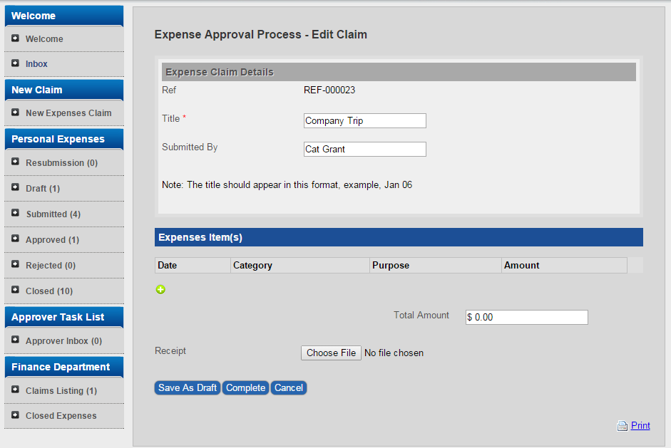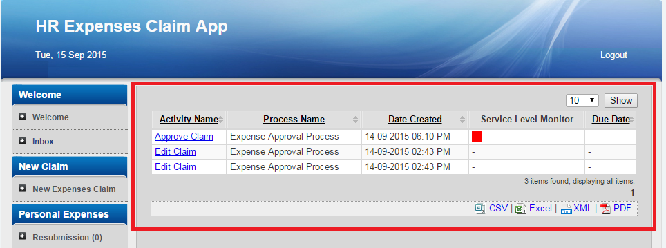 “ 收件箱”“用户查看”菜单显示当前用户绑定到当前应用程序的任务。