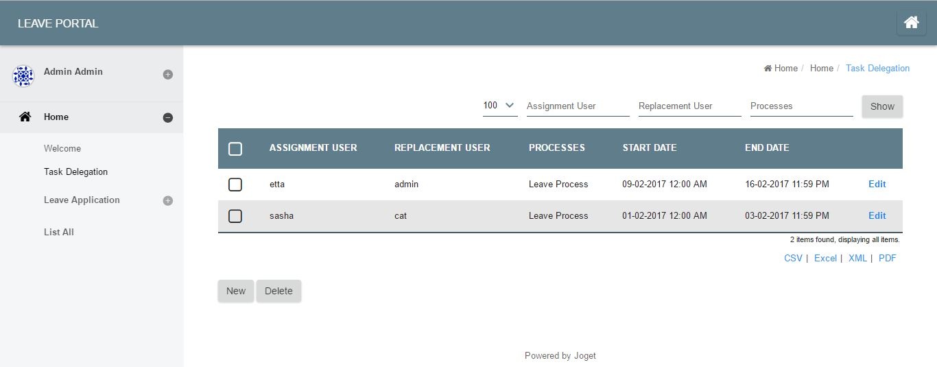 任务委派Userview元素允许任何授权用户在一段时间内临时将任务委派给不同的用户。