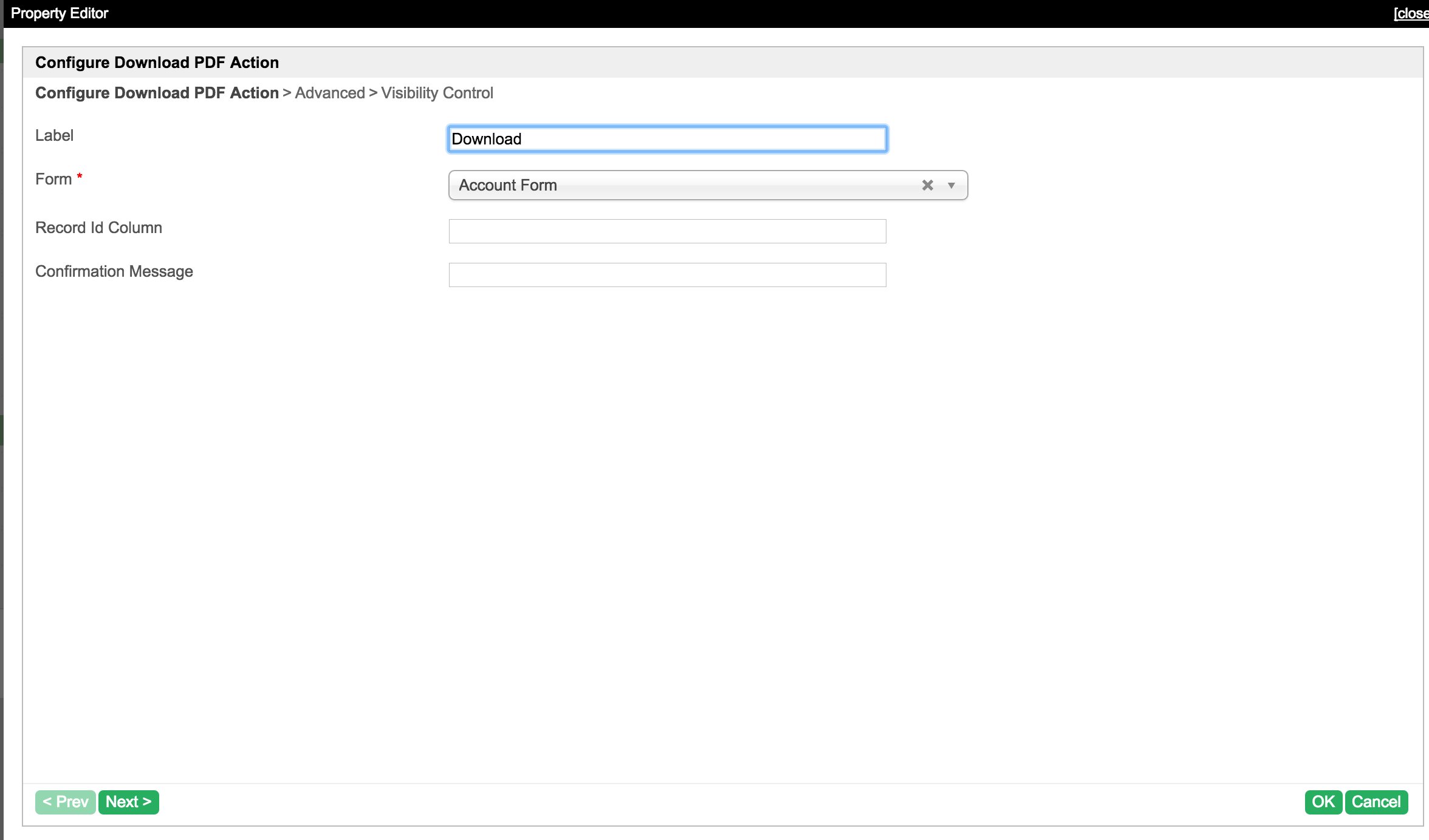 一旦我们将“下载PDF”操作拖放到数据生成器画布中,我们就可以编辑该操作。以下配置页面将根据我们的属性选项定义显示。