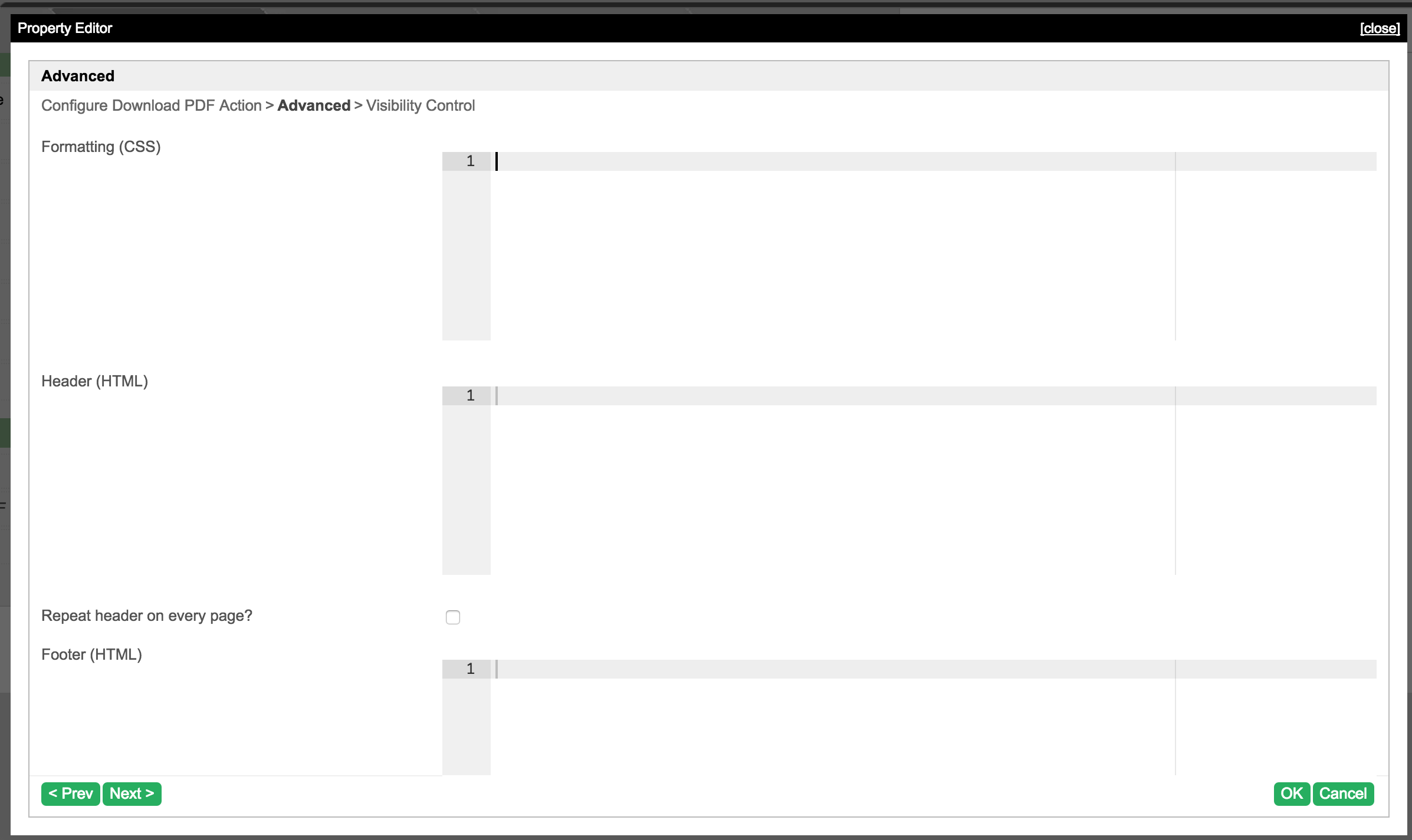 [{ title : '@@datalist.downloadPdf.config@@', properties : [{ name : 'label', label : '@@datalist.downloadPdf.label@@', type : 'textfield', value : '@@datalist.downloadPdf.download@@' }, { name : 'formDefId', label : '@@datalist.downloadPdf.form@@', type : 'selectbox', options_ajax : '[CONTEXT_PATH]/web/json/console/app[APP_PATH]/forms/options', required : 'True' }, { name : 'recordIdColumn', label : '@@datalist.downloadPdf.recordIdColumn@@', description : '@@datalist.downloadPdf.recordIdColumn.desc@@', type : 'textfield' }, { name : 'confirmation', label : '@@datalist.downloadPdf.confirmationMessage@@', type : 'textfield' }] }, { title : '@@datalist.downloadPdf.advanced@@', properties : [{ name : 'formatting', label : '@@datalist.downloadPdf.formatting@@', type : 'codeeditor', mode : 'css' }, { name : 'headerHtml', label : '@@datalist.downloadPdf.headerHtml@@', type : 'codeeditor', mode : 'html' }, { name : 'repeatHeader', label : '@@datalist.downloadPdf.repeatHeader@@', type : 'checkbox', options : [{ value : 'true', label : '' }] }, { name : 'footerHtml', label : '@@datalist.downloadPdf.footerHtml@@', type : 'codeeditor', mode : 'html' }, { name : 'repeatFooter', label : '@@datalist.downloadPdf.repeatFooter@@', type : 'checkbox', options : [{ value : 'true', label : '' }] }, { name : 'hideEmptyValueField', label : '@@datalist.downloadPdf.hideEmptyValueField@@', type : 'checkbox', options : [{ value : 'true', label : '' }] }, { name : 'showNotSelectedOptions', label : '@@datalist.downloadPdf.showNotSelectedOptions@@', type : 'checkbox', options : [{ value : 'true', label : '' }] }] }]