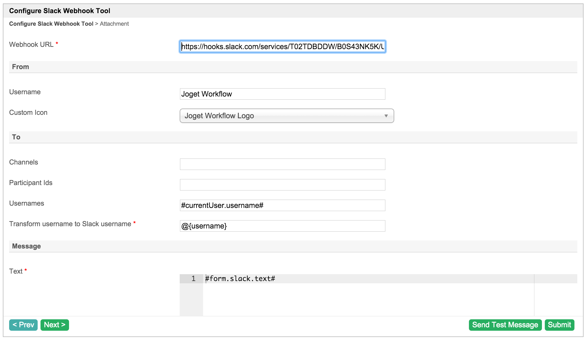 private SlackApi api = null; @Override public Object execute(Map props) { final Set<String> channelList = new HashSet<String>(); String channels = getPropertyString("channels"); if (!channels.isEmpty()) { String[] temp = channels.split(";"); for (String t : temp) { if (t.startsWith("#")) { channelList.add(t); } } } WorkflowAssignment wfAssignment = (WorkflowAssignment) getProperty("workflowAssignment"); String participantIds = getPropertyString("participantIds"); if (wfAssignment != null && !participantIds.isEmpty()) { String[] temp = participantIds.split(";"); if (temp.length > 0) { WorkflowManager workflowManager = (WorkflowManager) AppUtil.getApplicationContext().getBean("workflowManager"); WorkflowProcess process = workflowManager.getProcess(wfAssignment.getProcessDefId()); for (String pid : temp) { pid = pid.trim(); if (!pid.isEmpty()) { Collection<String> userList = WorkflowUtil.getAssignmentUsers(process.getPackageId(), wfAssignment.getProcessDefId(), wfAssignment.getProcessId(), wfAssignment.getProcessVersion(), wfAssignment.getActivityId(), "", pid); if (userList != null && userList.size() > 0) { for (String username : userList) { channelList.add(getSlackUsername(username, wfAssignment)); } } } } } } String usernames = getPropertyString("usernames"); if (!usernames.isEmpty()) { String[] temp = usernames.split(";"); for (String username : temp) { channelList.add(getSlackUsername(username, wfAssignment)); } } Thread sendMessageThread = new PluginThread(new Runnable() { public void run() { try { LogUtil.info(SlackWebhookTool.class.getName(), "SlackWebhookTool: Sending message to=" + channelList.toString()); sendMessage(channelList); LogUtil.info(SlackWebhookTool.class.getName(), "SlackWebhookTool: Sending message completed to=" + channelList.toString()); } catch (Exception ex) { LogUtil.error(SlackWebhookTool.class.getName(), ex, ""); } } }); sendMessageThread.setDaemon(true); sendMessageThread.start(); return null; } protected SlackApi getApi() { if (api == null) { api = new SlackApi(getPropertyString("url")); } return api; } protected String getSlackUsername(String username, WorkflowAssignment assignment) { String syntax = getPropertyString("usernameTransform"); syntax = syntax.replaceAll(StringUtil.escapeRegex("{username}"), StringUtil.escapeRegex(username)); return AppUtil.processHashVariable(syntax, assignment, null, null); } protected void sendMessage(Set<String> channels) { SlackMessage message = createMessage(); if (channels != null && !channels.isEmpty()) { for (String channel : channels) { if (!channel.isEmpty()) { sendMessage(channel, message); } } } else { sendMessage(null, message); } } protected void sendMessage(String channel, SlackMessage message) { if (channel != null && !channel.isEmpty()) { message.setChannel(channel); } getApi().call(message); } protected SlackMessage createMessage() { SlackMessage message = new SlackMessage(getPropertyString("text")); String username = getPropertyString("username"); if (!username.isEmpty()) { message.setUsername(username); } String customIcon = getPropertyString("customIcon"); if (!customIcon.isEmpty()) { if ("joget".equals(customIcon)) { HttpServletRequest request = WorkflowUtil.getHttpServletRequest(); if (request != null) { String url = request.getScheme() + "://" + request.getServerName() + ":" + request.getServerPort() + request.getContextPath() + "/images/v3/logo.png"; message.setIcon(url); } } else if ("url".equals(customIcon)) { message.setIcon(getPropertyString("iconUrl")); } else { message.setIcon(getPropertyString("iconEmoji")); } } message.setUnfurlLinks("true".equalsIgnoreCase(getPropertyString("unfurl_links"))); message.setUnfurlMedia("true".equalsIgnoreCase(getPropertyString("unfurl_media"))); boolean hasAttachment = false; SlackAttachment atatchment = new SlackAttachment(); String fallback = getPropertyString("fallback"); if (!fallback.isEmpty()) { atatchment.setFallback(fallback); } String color = getPropertyString("color"); if (!color.isEmpty()) { atatchment.setColor(color); } String pretext = getPropertyString("pretext"); if (!pretext.isEmpty()) { atatchment.setPretext(pretext); hasAttachment = true; } String author_name = getPropertyString("author_name"); if (!author_name.isEmpty()) { atatchment.setAuthorName(author_name); } String author_link = getPropertyString("author_link"); if (!author_link.isEmpty()) { atatchment.setAuthorLink(author_link); } String author_icon = getPropertyString("author_icon"); if (!author_icon.isEmpty()) { atatchment.setAuthorIcon(author_icon); } String attachment_title = getPropertyString("attachment_title"); if (!attachment_title.isEmpty()) { atatchment.setTitle(attachment_title); hasAttachment = true; } String attachment_title_link = getPropertyString("attachment_title_link"); if (!attachment_title_link.isEmpty()) { atatchment.setTitleLink(attachment_title_link); } String attachment_text = getPropertyString("attachment_text"); if (!attachment_text.isEmpty()) { atatchment.setText(attachment_text); hasAttachment = true; } String image_url = getPropertyString("image_url"); if (!image_url.isEmpty()) { atatchment.setImageUrl(image_url); hasAttachment = true; } String thumb_url = getPropertyString("thumb_url"); if (!thumb_url.isEmpty()) { atatchment.setThumbUrl(thumb_url); hasAttachment = true; } Object[] fields = null; Object fieldsProperty = getProperty("fields"); if (fieldsProperty != null && fieldsProperty instanceof Object[]){ fields = (Object[]) fieldsProperty; } if (fields != null && fields.length > 0) { for (Object o : fields) { Map mapping = (HashMap) o; String title = mapping.get("title").toString(); String value = mapping.get("value").toString(); String isShort = mapping.get("short").toString(); SlackField field = new SlackField(); field.setTitle(title); field.setValue(value); field.setShorten("true".equalsIgnoreCase(isShort)); atatchment.addFields(field); hasAttachment = true; } } if (hasAttachment) { message.addAttachments(atatchment); } return message; }