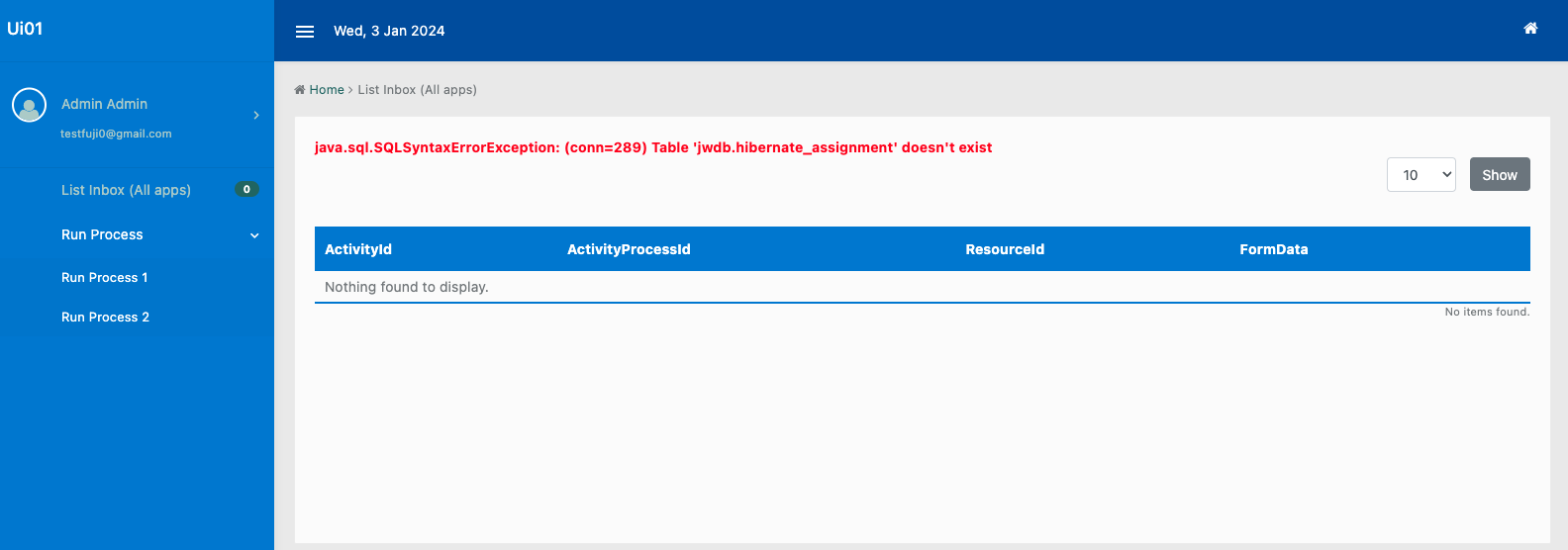 Figure 8: List Inbox with record for Process 1