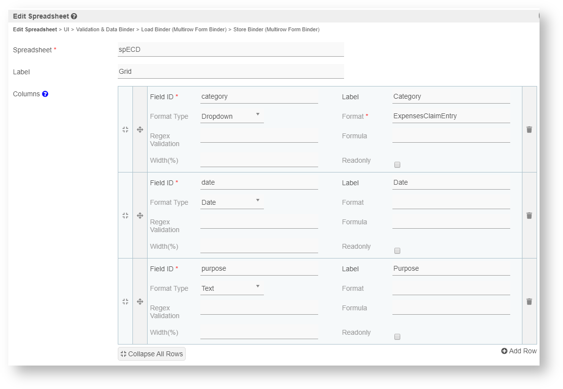 | Load & Save Binders | Load Binder allows you to customize the method for data retrieval to populate the multi-row spreadsheet in the form. Save Binder allows you to customize the method on how the spreadsheet row records are saved to. This option is empty by default. An empty binder means that the spreadsheet records will be saved/loaded as a JSON format in the parent form & database table. See the list of available Form Binders. The recommended binder to use is the Multirow Form Binder so that each record is saved into a child database table via a subform definition. The binder will update the foreign key "parent id" into each child record to point to the parent database table. |