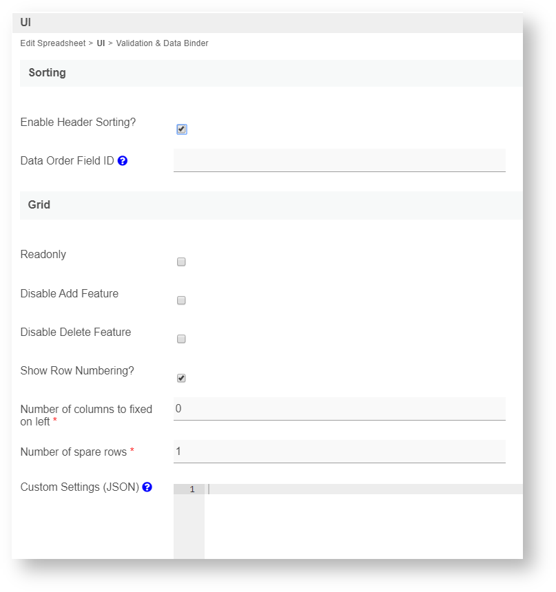 | Data Order Field ID | Field Id to store the ordering sequence of spreadsheet row. The property field "Data Order Field ID" stores the form grid record row sequence, meaning it records which ID sits in row 1, row 2, and so on and rearranges it back in this same ascending sequence on load binder. If you are using this property, key in a unique field ID in "Data Order Field ID" property . This field ID must *not* be an existing field in your form which you use for your form data. Typically we use the field ID "sort" and Joget will automatically create this column in your database table (Do not use the field ID "sort" anywhere else in your form). If you need automatic sorting on another column value on loading the form grid/spreadsheet, use Load Grid Data with Custom Sorting and Filtering or JDBC Form Binder with the "... ORDER BY ASC" SQL statement. |