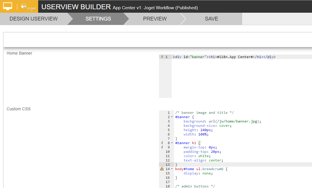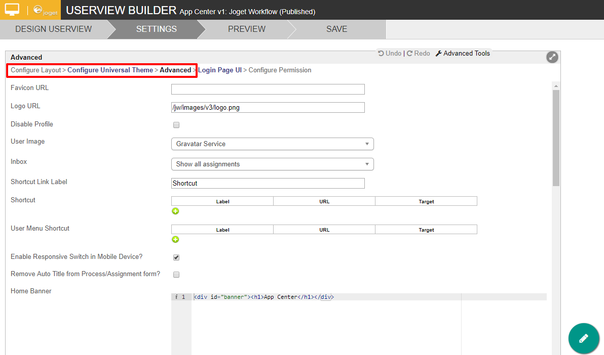 - The logo that is displayed in the App Center can be changed under Userview Builder's settings > Logo URL.