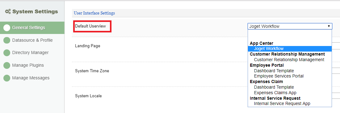 Any Userview from any apps can be used a the default Userview. The default Userview here serves as the landing page when someone visits Joget Workflow.