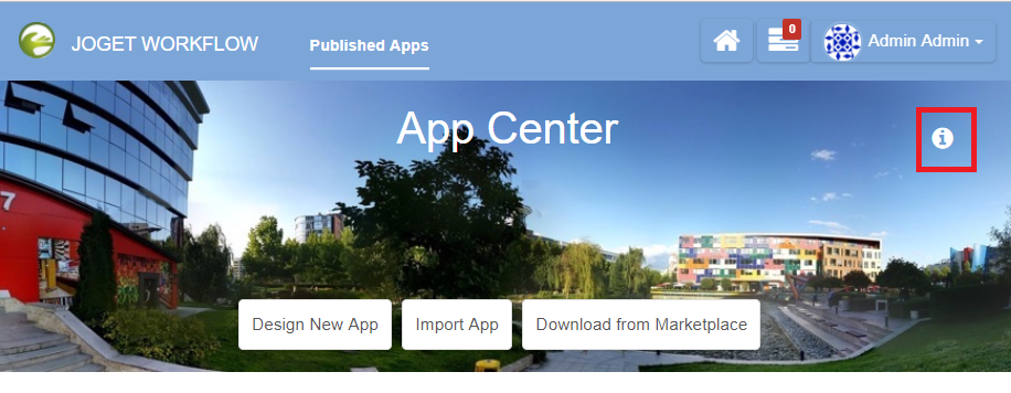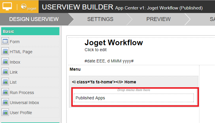 In the default installation, an app called "App Center" with the Userview named "Joget Workflow" is preloaded in