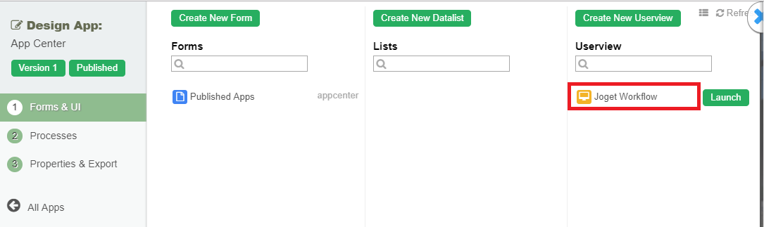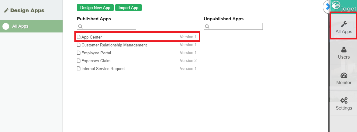 在默认安装中,预先加载名为“Joget Workflow”的名为“App Center”的应用程序