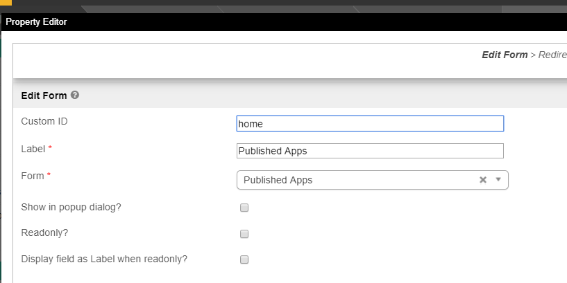 - 这是一个表单菜单,指向名为“发布的应用程序”的表单。