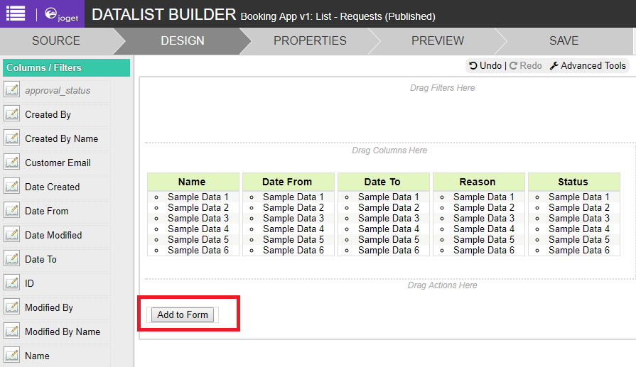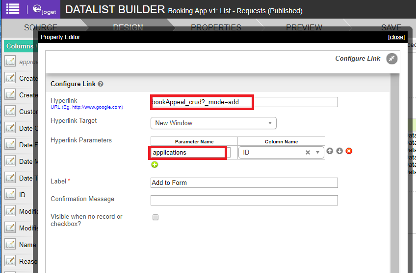 打开Datalist Builder中的列表。添加超链接操作并对其进行配置。