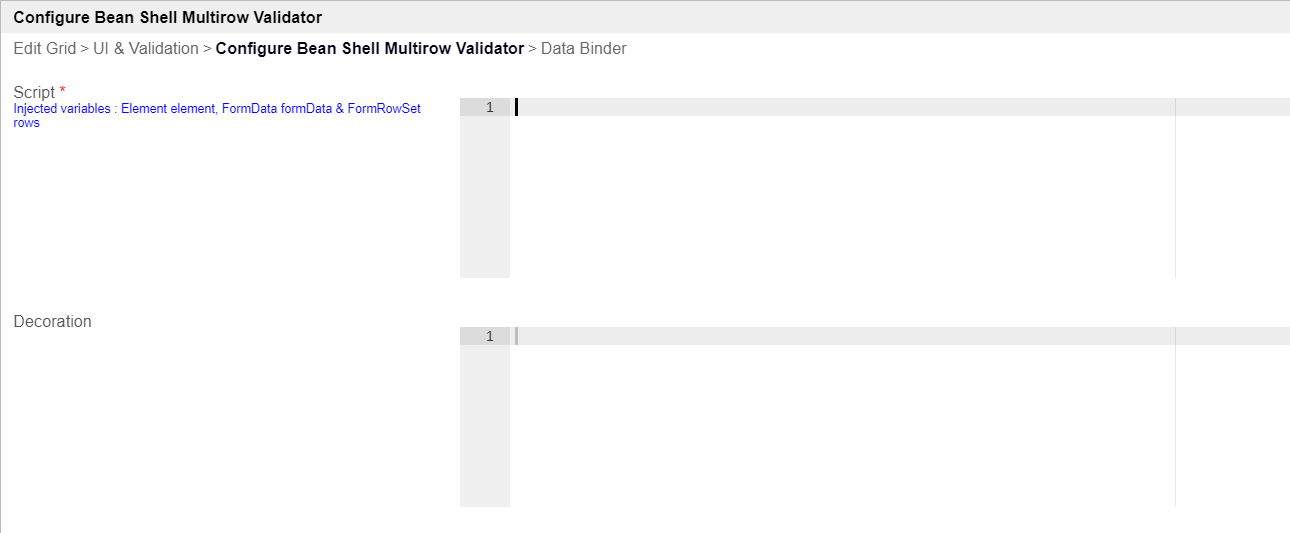 Bean Shell 多行验证器 允许您编写自定义的Java编码来验证多行表单元素,如Form Grid,Spreadsheet,Advanced Grid等。