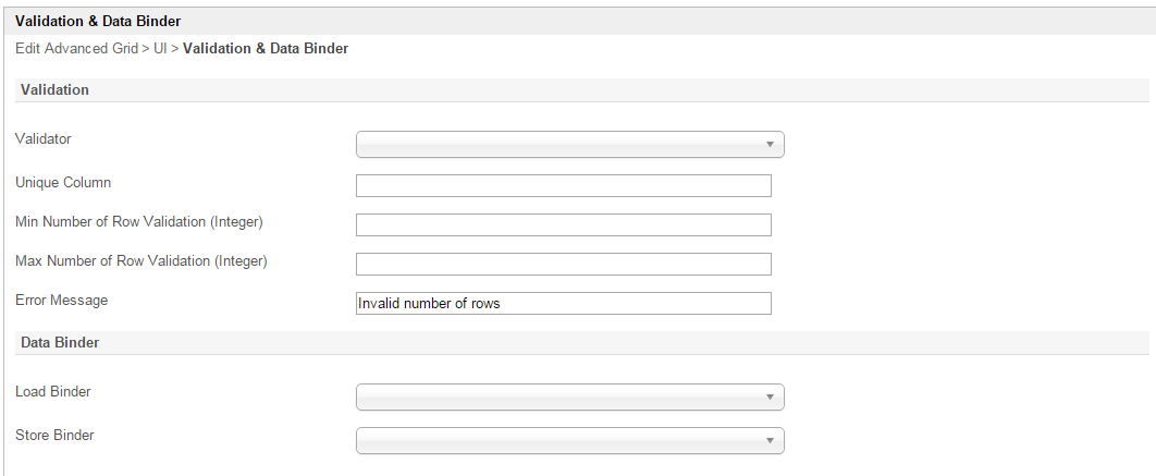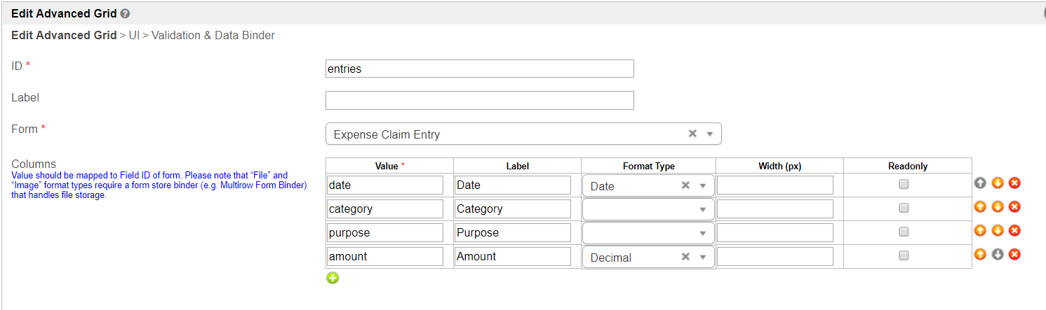 Store Binder | ตัวเลือกโดยค่าเริ่มต้น ข้อมูลกริดจะถูกบันทึก / โหลดในรูปแบบ JSON ในเซลล์ฐานข้อมูลที่กำหนดไว้ ในตัวอย่างนี้ Multirow Form Binder ถูกใช้เพื่อโหลดข้อมูลจากฟอร์มอื่น สิ่งที่ผูกกับฟอร์ม (Form Binder) |