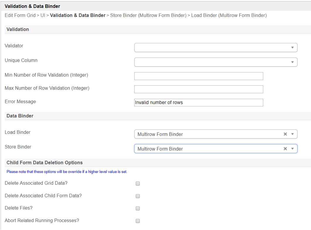 Delete Associated Grid Data? | หากฟอร์มป๊อปอัพมีรายการในตารางตัวเลือกนี้จะลบข้อมูลภายในตาราง Caution ตัวเลือก 3 ตัวเหล่านี้: (ลบข้อมูลตารางที่เชื่อมโยง, ลบข้อมูลแบบฟอร์มลูกที่เกี่ยวข้อง, ลบไฟล์) โดยใช้ร่วมกับองค์ประกอบ ตาราง / ลูกตารางซ้อนกัน ตัวเลือกเหล่านี้ลัดไปที่แผนผังทั้งหมด เมื่อพบเงื่อนไข 'เท็จ' มันจะย้ายไปยังองค์ประกอบตาราง / ลูกตารางถัดไป ตัวอย่าง: พิจารณาว่าฟอร์มป๊อปอัปมีตารางมีฟอร์มย่อยมีองค์ประกอบการอัปโหลดไฟล์ที่มี abc.pdf หากตรวจสอบตัวเลือกทั้งหมด abc.pdf จะถูกลบ หากทุกคนยกเว้นหนึ่งในตัวเลือกที่เลือกไว้ abc.pdf จะไม่ถูกลบ |