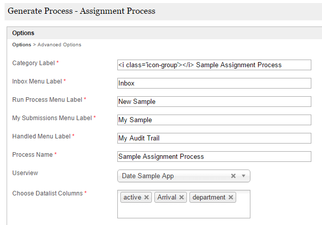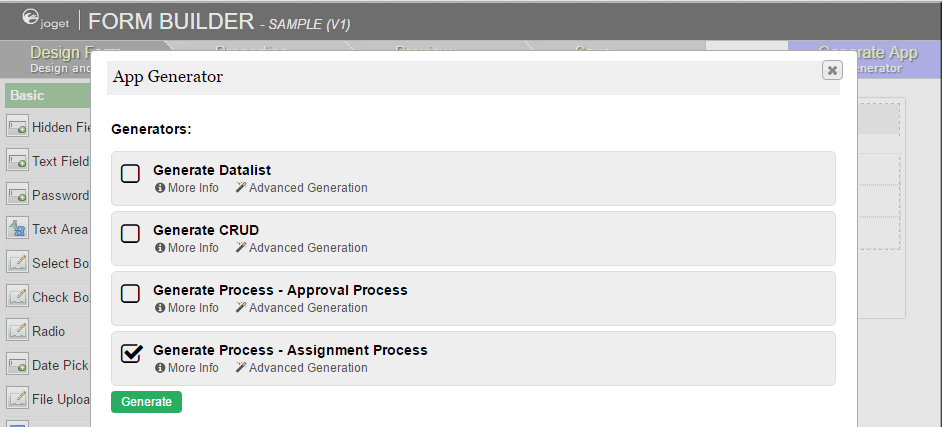 Generate Process - Assignment Process ฟังก์ชั่นจะสร้างการไหลของกระบวนการทั่วไปพร้อมกับแบบฟอร์มที่สมบูรณ์และรายการเมนู userview ลงในแอพที่คุณอยู่