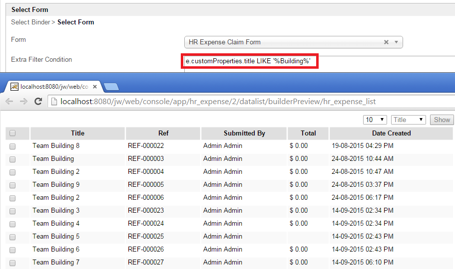 Extra Filter Condition | เงื่อนไขเพิ่มเติมสำหรับการกรองชุดข้อมูล HQL เป็นที่คาดหวังที่นี่ Syntax Query เริ่มต้นชื่อตัวกรองด้วย e.customProperties. ตามด้วย field id (i.e. title) HQL is accepted คุณอาจจะใช้ตัวดำเนินการเช่น "LIKE" เพื่อจำกัดชุดข้อมูลของคุณให้แคบลง Sample e.customProperties.title = 'Trip' ตัวแปร Hash ที่ถูกยอมรับ Sample e.customProperties.submitted_by = '#currentUser.id#' Userview Key สามารถใช้เป็นส่วนหนึ่งของเงื่อนไขได้ Sample e.customProperties.category_id = '#userviewKey#' |