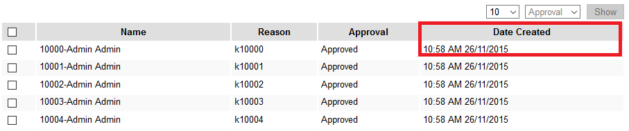 รูปที่ 5: มุมมองรายการสร้างของดาตาลิสต์ ที่เปิดใช้งานในคอลัมน์วันที่สร้าง