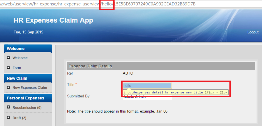 Userview Key Name | เมื่อตั้งค่าให้ชี้ไปที่ชื่อการป้อนข้อมูลแบบฟอร์มที่สอดคล้องกับค่าคีย์ ของ Userview จะถูกตั้งค่าไว้ในฟิลด์เฉพาะ Example Userview Key Value: hello Userview Key Name: expenses_detail_hr_expense_new_title |