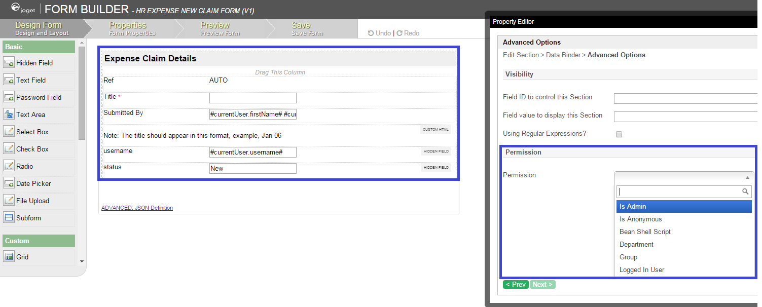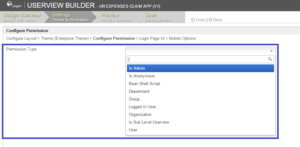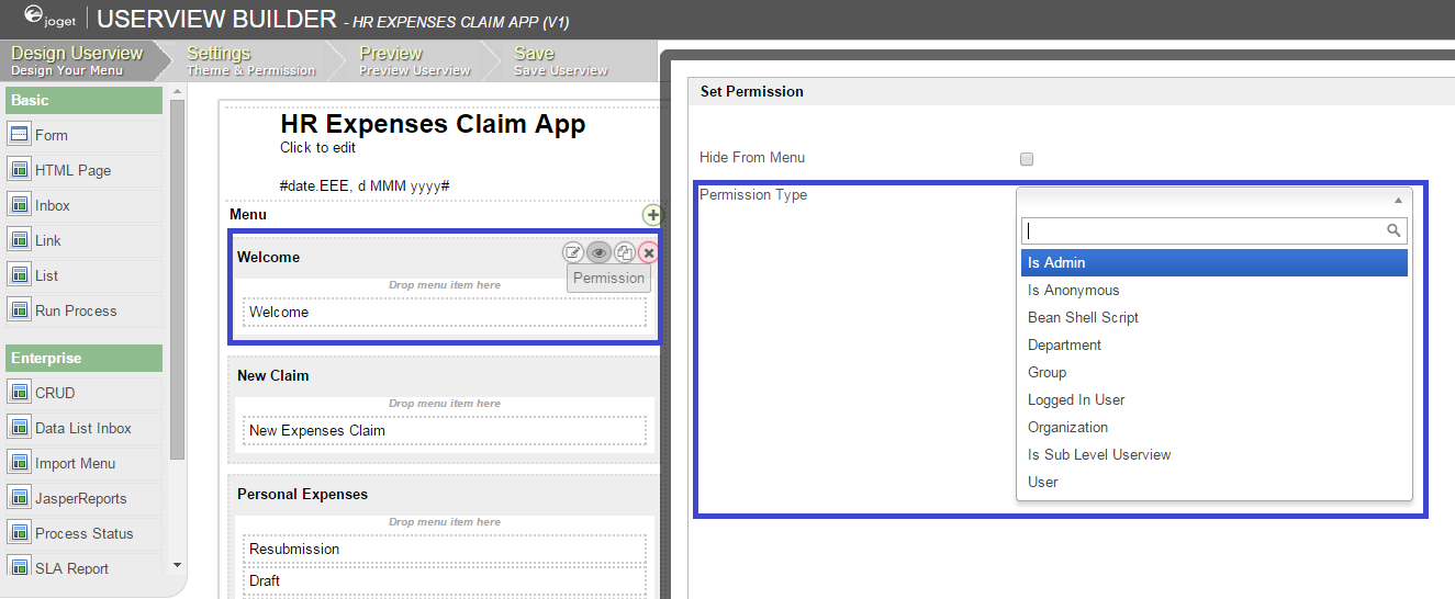 Permission Control ใช้เพื่อควบคุมการเข้าถึงส่วนประกอบต่างๆใน Joget มี 4 ส่วนที่สามารถควบคุมสิทธิ์การเข้าถึงได้ คือ:-