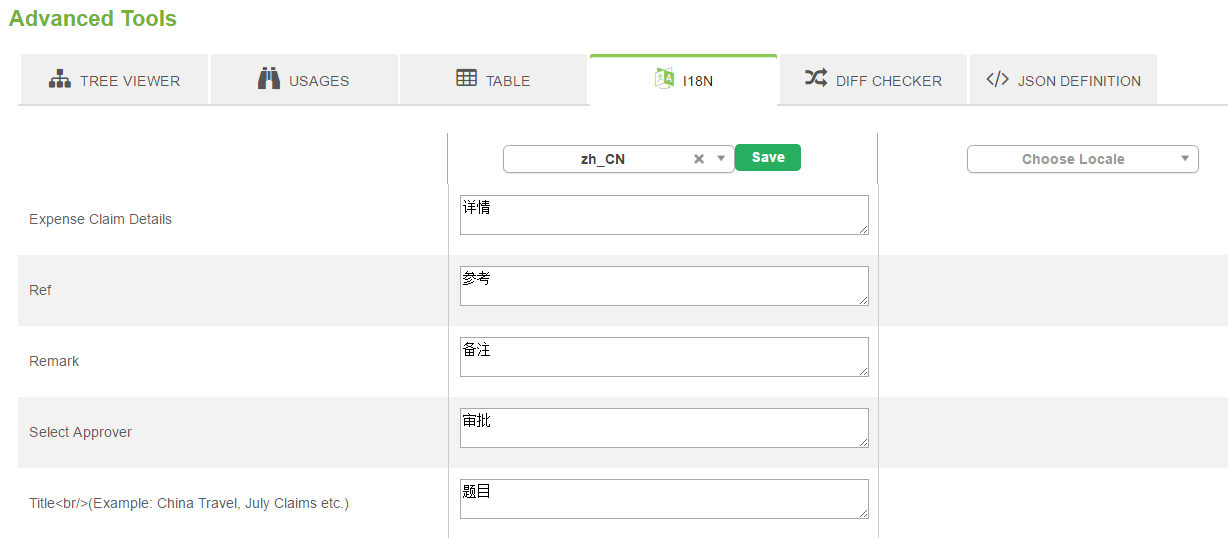 คอลัมน์ตารางที่มีอยู่จะแสดงรายการไว้สำหรับการอ้างอิงของตัวออกแบบแอป รูปที่ 7: Advanced Tools - i18n Internationalization ชื่อกำกับที่กำหนดในโปรแกรมสร้างจะถูกแสดงโดยอัตโนมัติที่นี่เพื่อวัตถุประสงค์สากล เราสามารถกำหนดในหลายภาษาตามที่เราต้องการi18n Internationalization