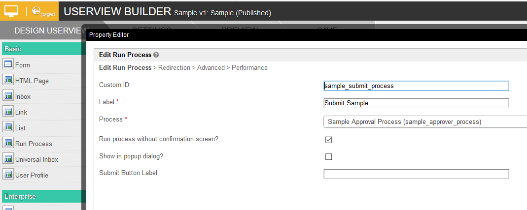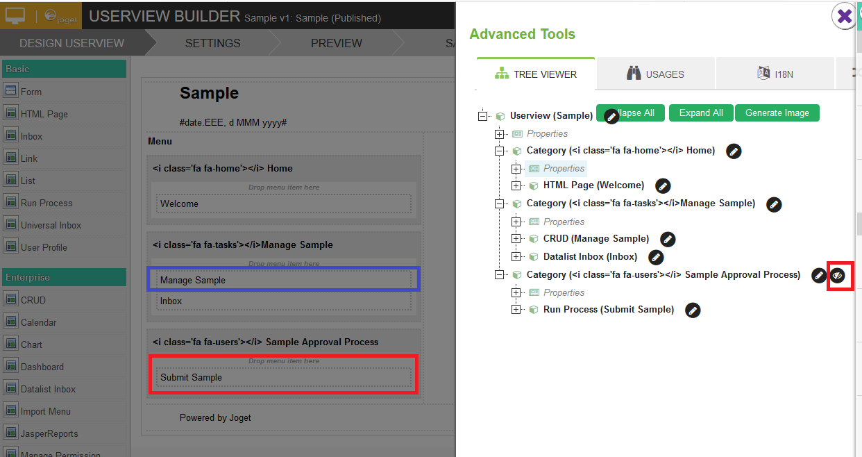 “提交样本”是“运行过程”元素,“管理样本”是“CRUD”元素。我们可以将“运行流程”的功能组合到CRUD的添加按钮中。有了这个,我们可以隐藏“样本批准过程”类别。