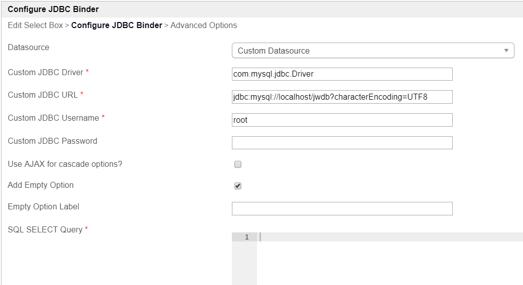 JDBC Options Binder allows you to retrieve form options from Joget or custom database via user-defined SQL statements.
