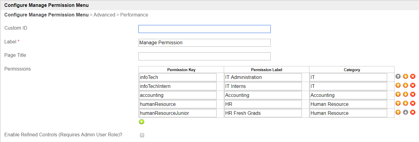 该 权限菜单 允许您配置在运行时用户定义的组类别权限。