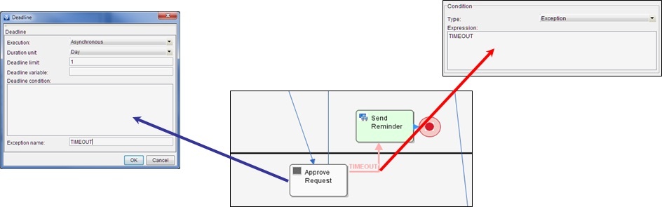 - When a deadline is triggered, and where the exception name matches the one set for a transition, the flow will execute along that transition to the next element along the workflow.