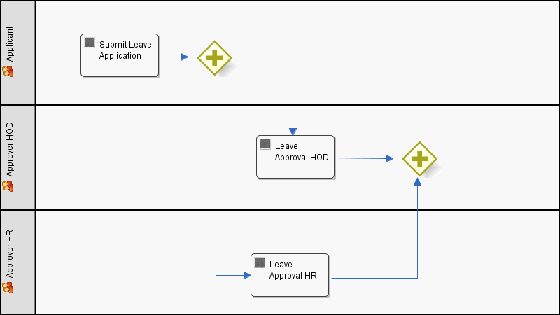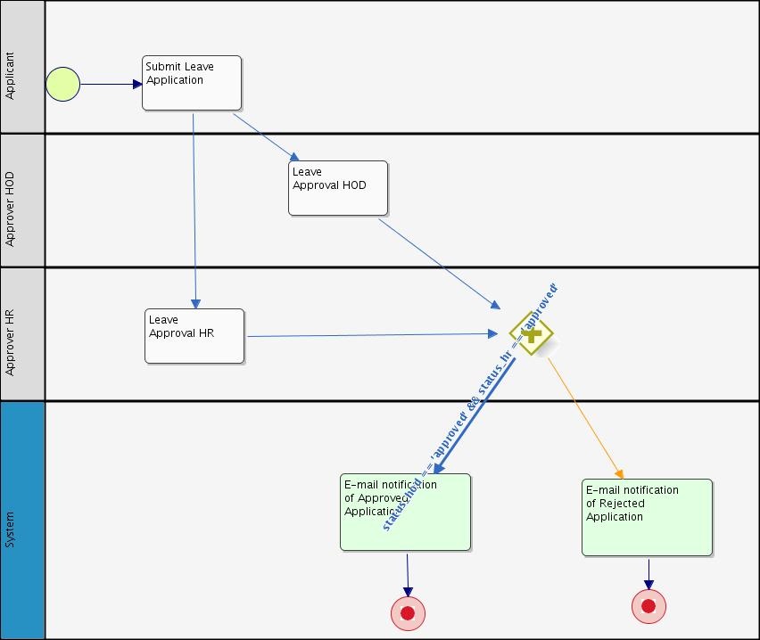 I have joined the two transitions with an AND. Now here, both the tasks must be completed before the mail is sent. If both HOD and HR approve the leave request, then only the leave approved mail should be sent to the applier. Else if one of them rejects the approval, the rejected mail should be sent. I have used two seperate variables for both forms, i.e. approver_hod and approver_hr.