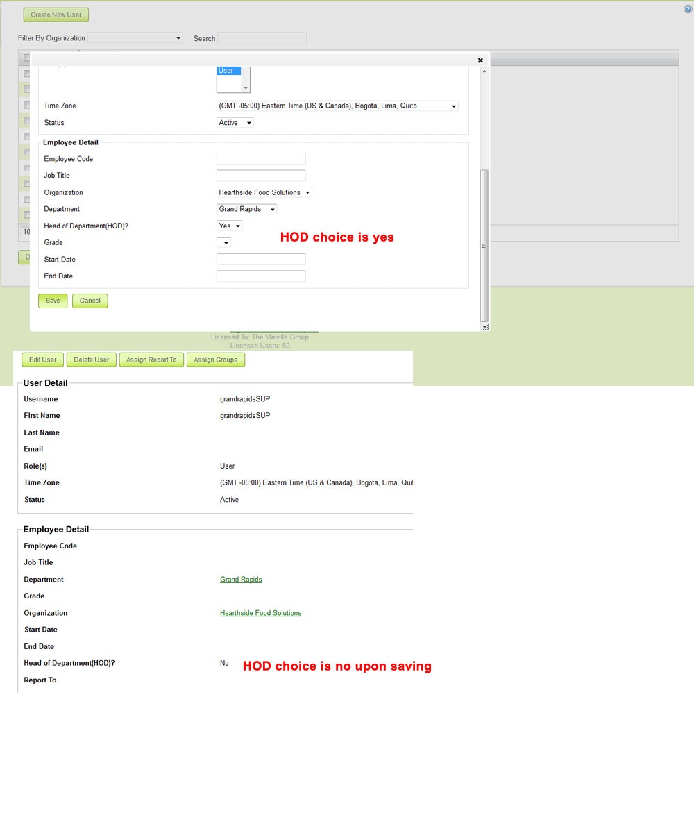 When I create a NEW USER, the HOD yes choice doesn't save upon initial submit. When I edit the user and choose YES for HOD, it then holds.