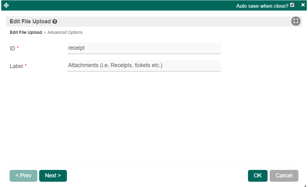 ID | Element ID (By declaring as "receipt", a corresponding database table column "c_receipt" will be created) Please see Form Element for more information about defining the ID and list of reserved IDs. |