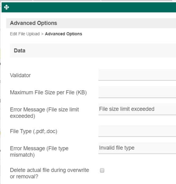 Maximum File Size (KB) | Maximum File Size (KB) in Integer. For example, if the maximum allowable file size is 10 megabytes, enter into this field the value of "10240" which represent 10,240 kilobytes. |