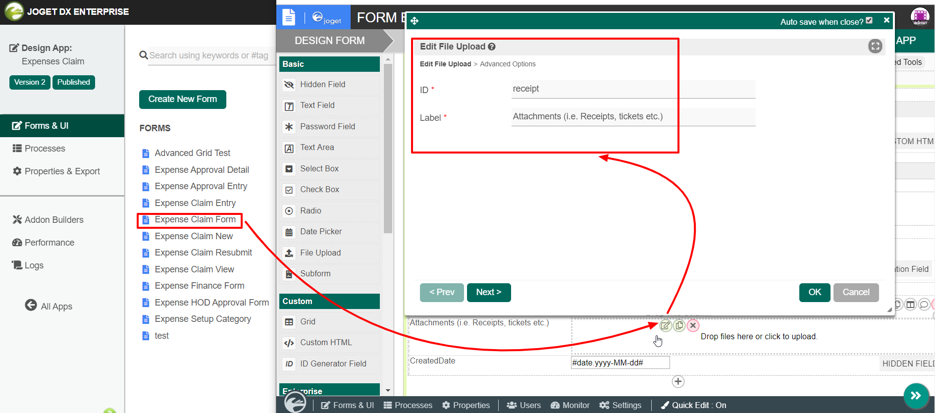 - Log in as admin and click on the pencil icon on the Expenses Claim to open the Design App. (see Figure 1)