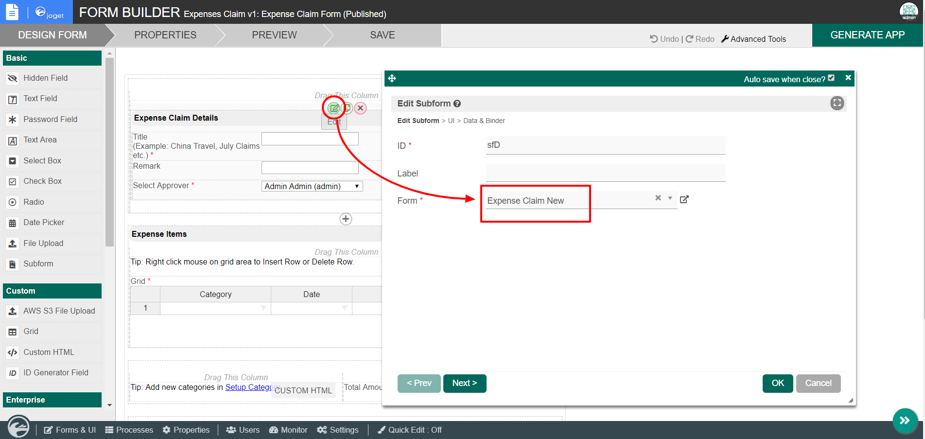 - Log in as admin and click on the pencil icon on the Expenses Claim to open the Design App. (see Figure 1)