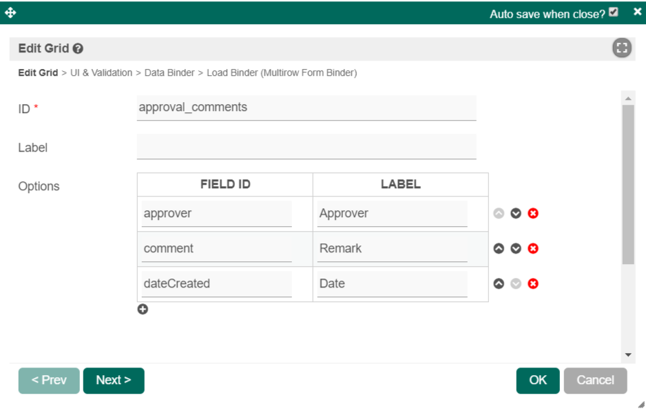 ID | Element ID (By declaring as "approval_comments", a corresponding database table column "c_approval_comments" will be created) Please see Form Element for more information about defining the ID and list of reserved IDs. |