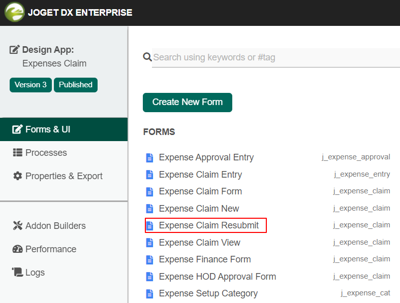 - Log in as admin and click on the pencil icon on the Expenses Claim to open the Design App. (see Figure 1)