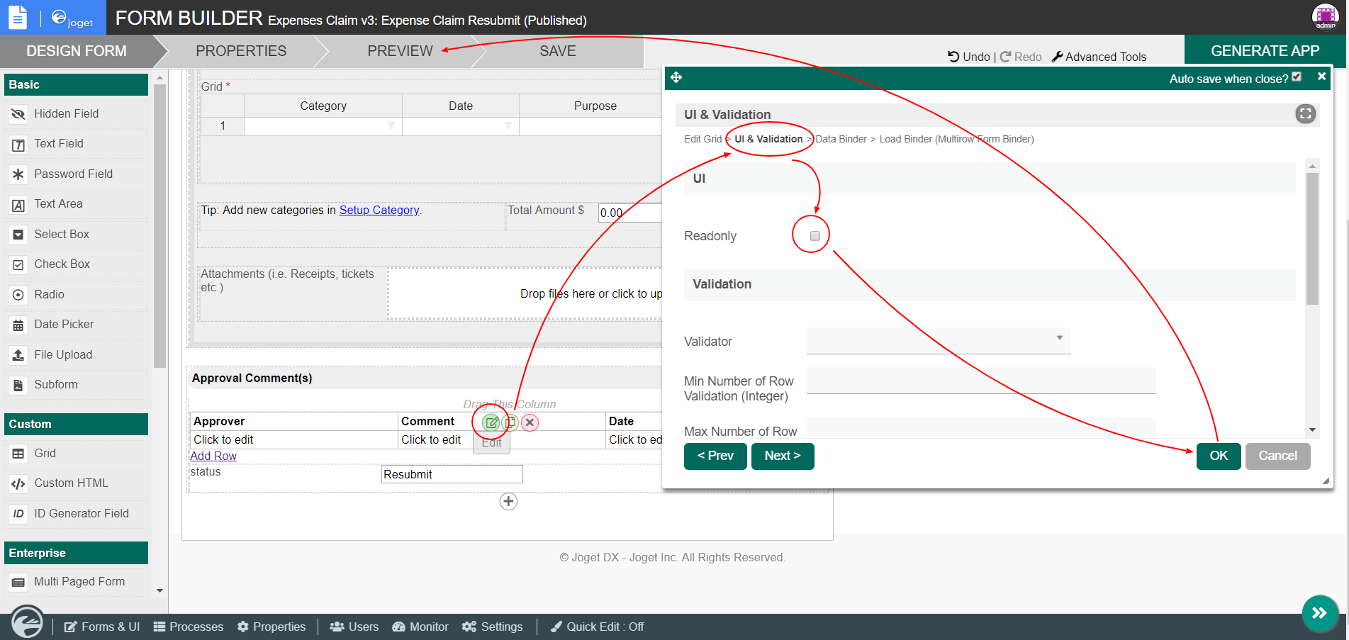 Figure 2 - Hover the mouse over the Grid element on the canvas under Approval Comment(s) section and click on Edit to open up the Edit Grid properties.