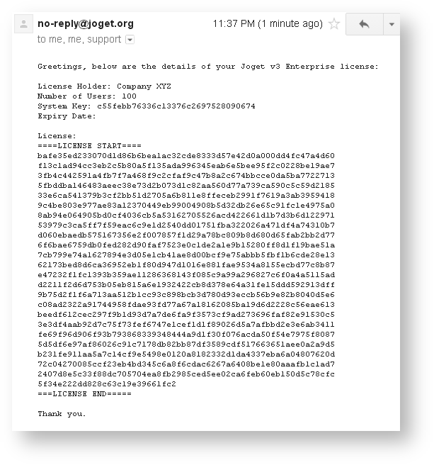 - After you have submitted your "Request for Enterprise License" form, if approved (usually not more than 24 hours), you will receive an email with the "License" key.