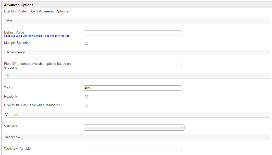 Default Value | Default Value when there's no existing value found/selected. Hash variable is accepted here. For example, you may key the following #currentUser.firstName# #currentUser.lastName# to pre-populate the field with current logged in user's name. You may define multiple default options by separating them using semicolons. Sample option1;option2;option3 |