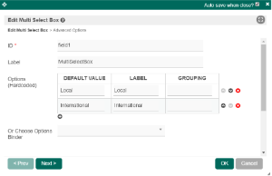 Options (Hardcoded) | Select Box options Options defined here will not be put into use if Options Binder is defined below. | |