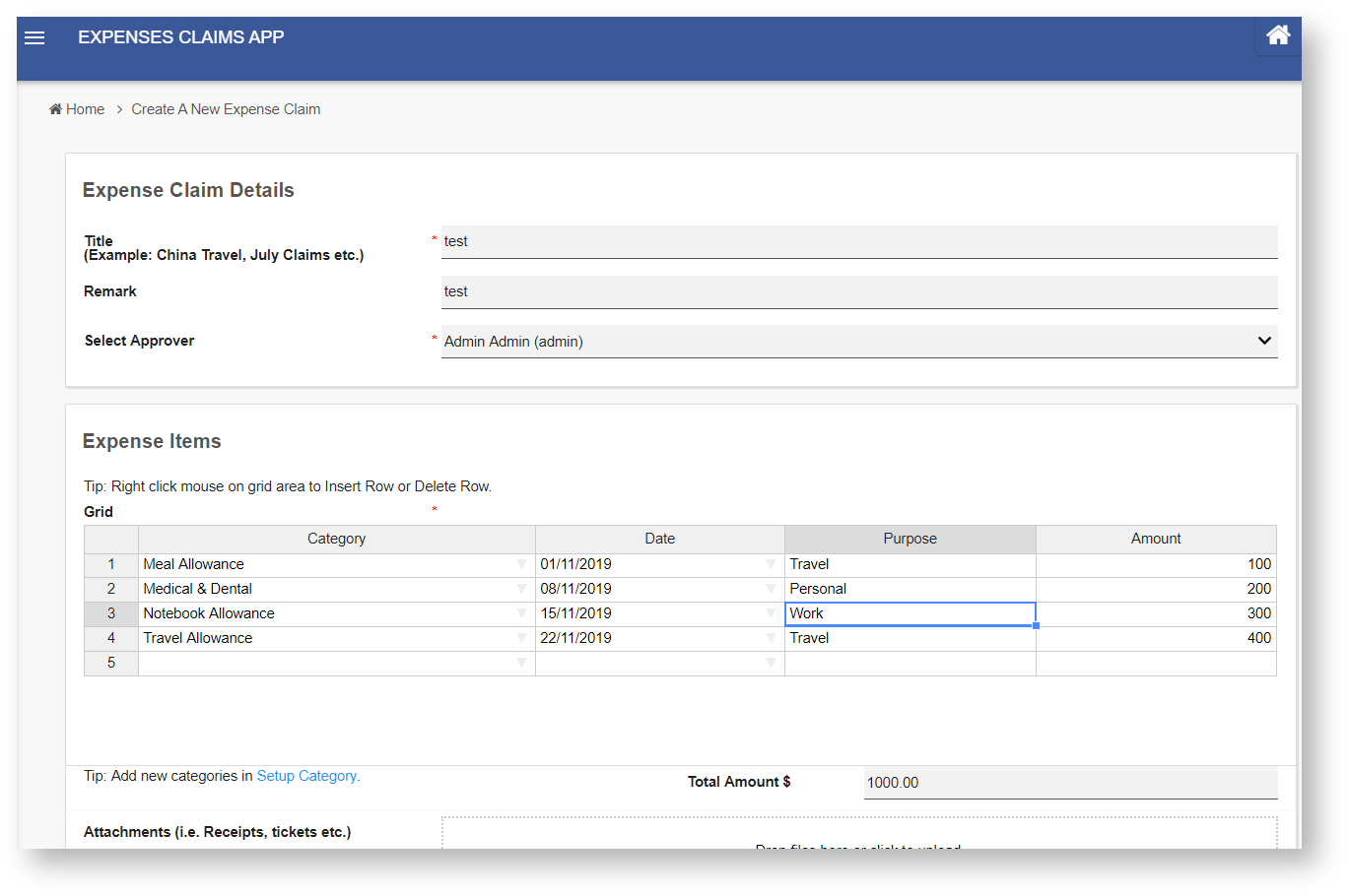 Figure 1 : Example Spreadsheet Form Element in Expenses Claim app