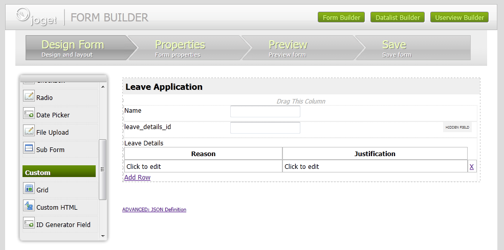 Note: Every "value" in the Grid properties must match their corresponding fields in the selected table.