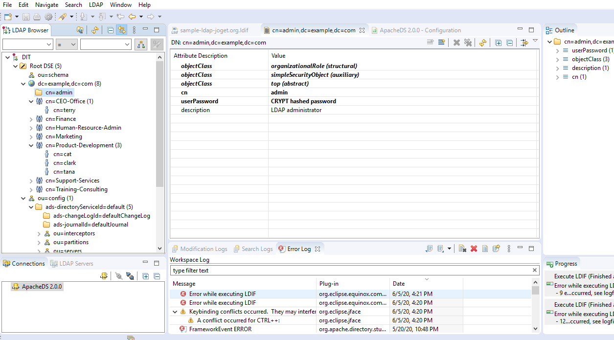 This is my Apache Directory Studio. I ran sample-ldap-joget.org.ldif file to create user according to document. But still showing error. Can anyone tell me details about this issue. I am new to LDAP. Thank You