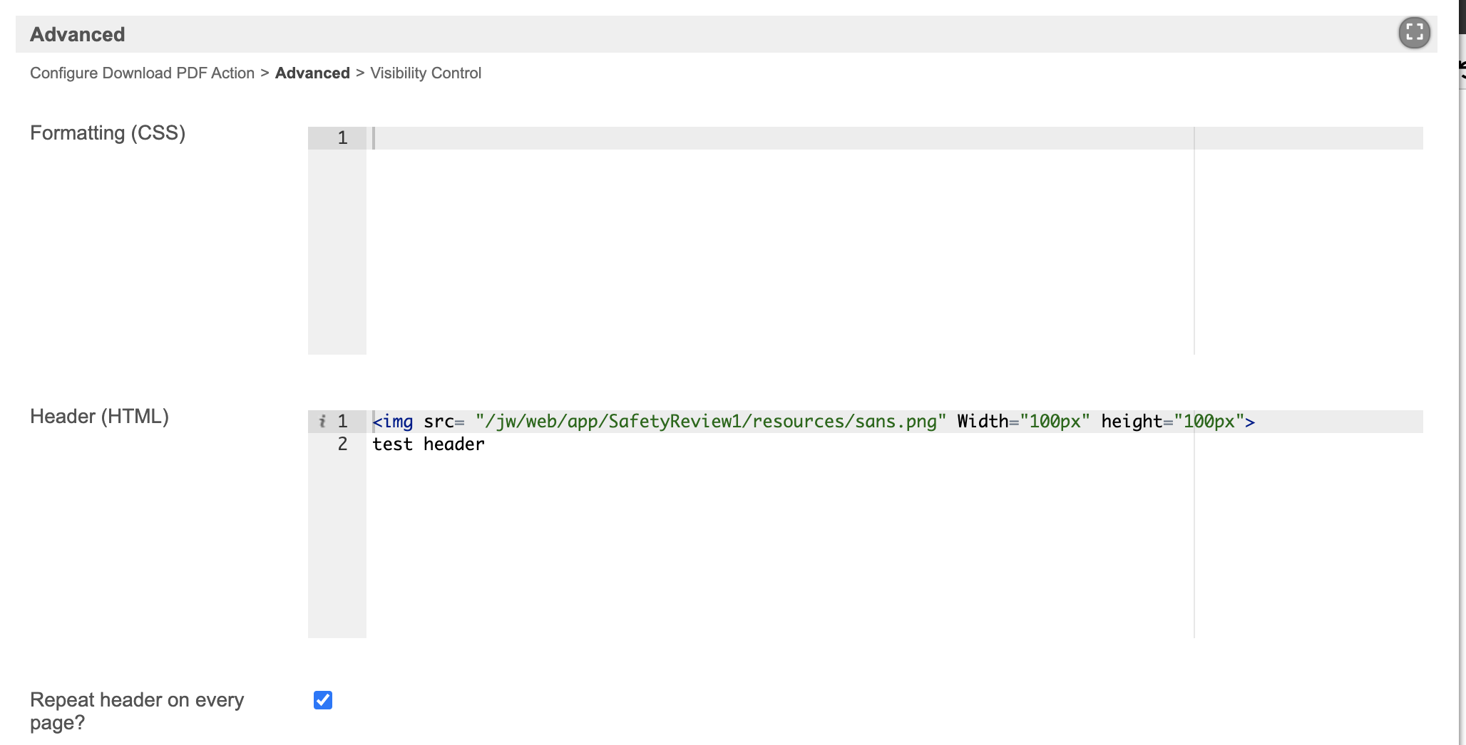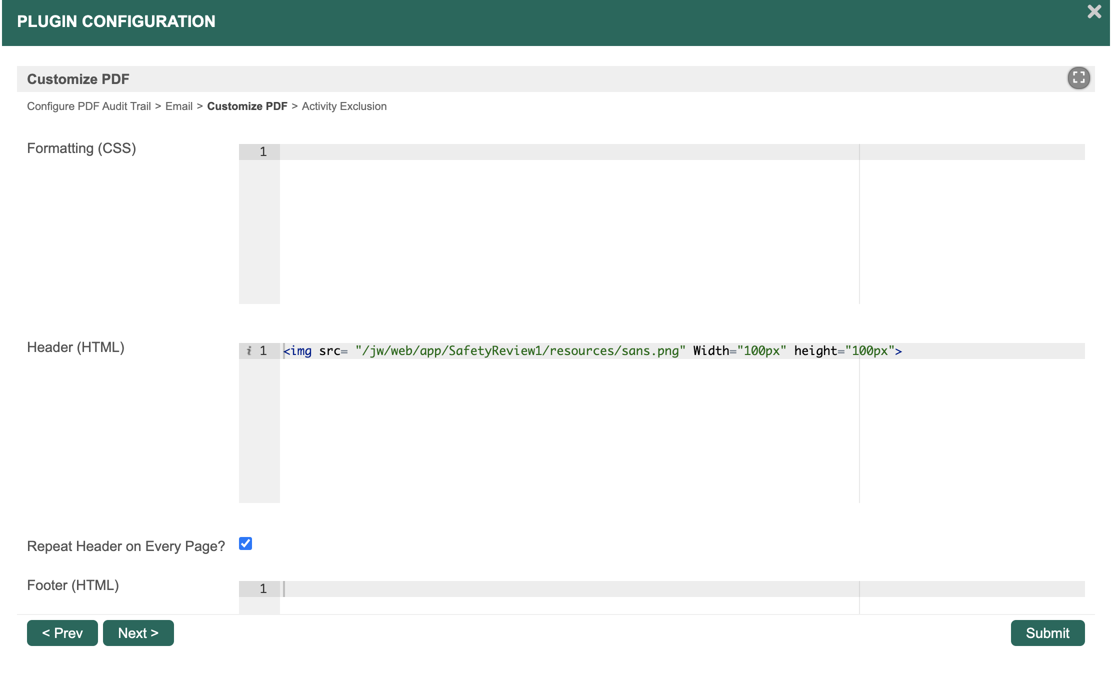 What is the correct formula for writing a header(HTML) that contains a link image (logo): in a tool PDF Audit Trail Plugin