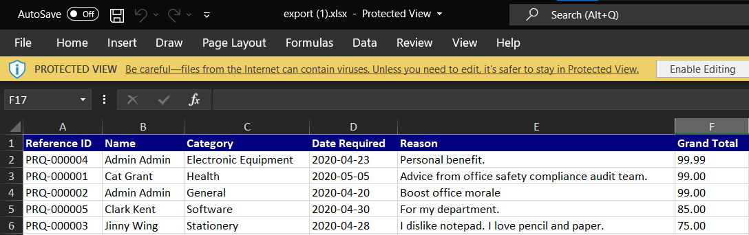 Here is a sample screenshot to show how it looks like in Excel and PDF