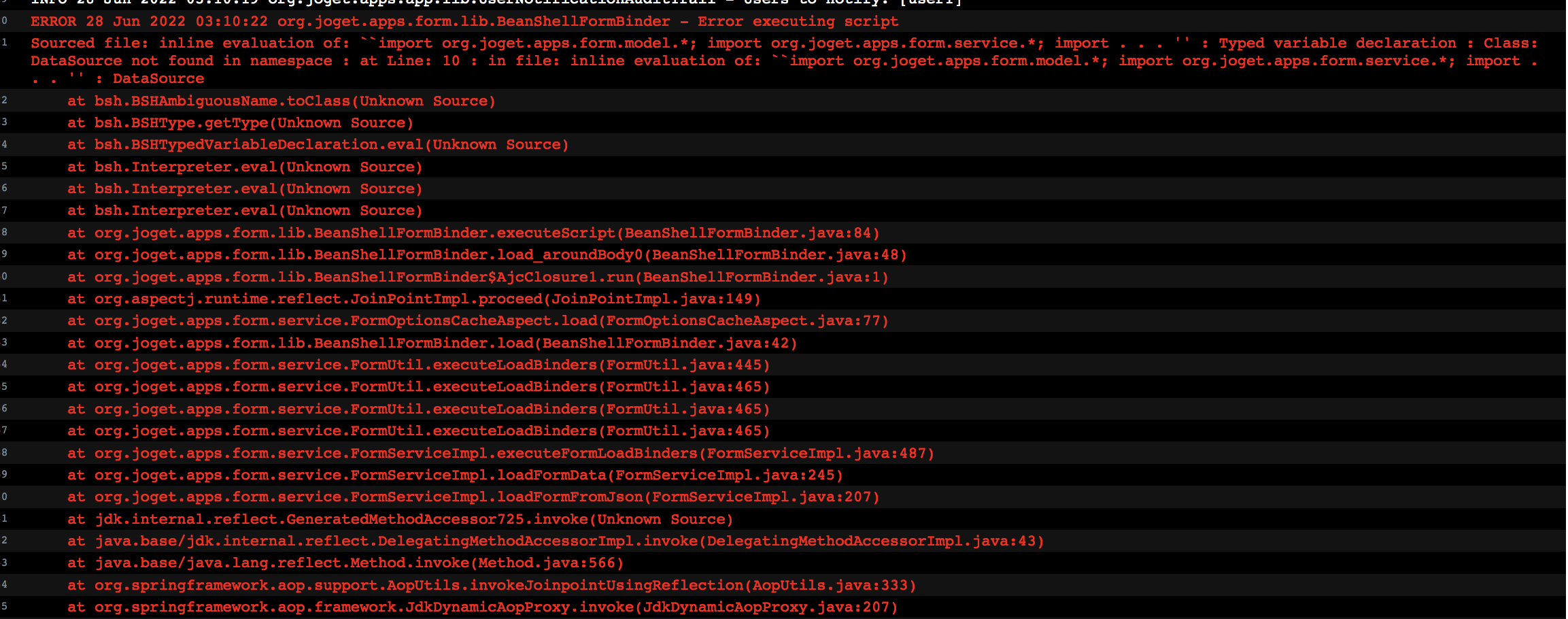 says in your error log there's "class: Datasource not found in namespace" in one of your beanshell form binder. Did you import the class into the beanshell?