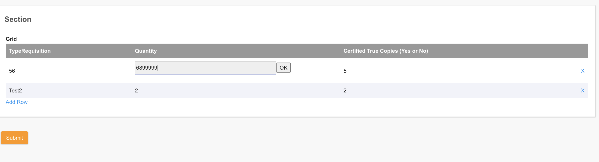 Yeah for storing the grid listing it's basically a 1-to-many relationship i.e 1 Company Secretary Requisition Form has many type requisitions. You'll need a foreign key and possibly another table so whatever you update the grid, it won't affect typerequisition table.
