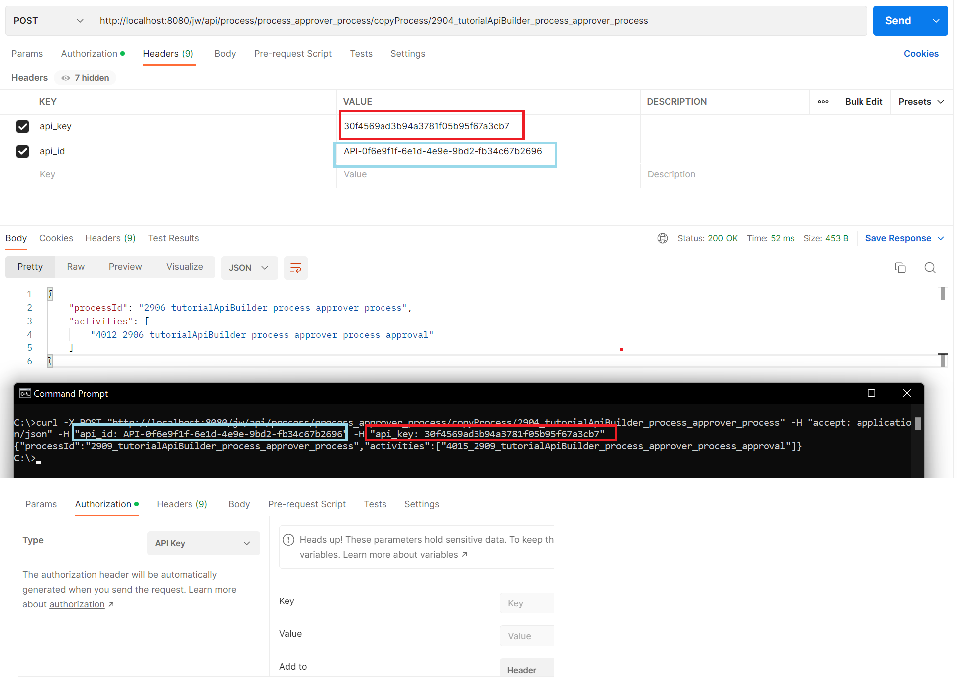 - API Builder → OAS3 Document → curl command: yeah I think this is just a sample. If you try changing api_key & api_id on curl, it'll work.
