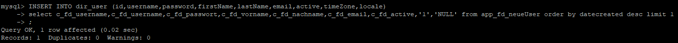 So that the users are created in the official table "dir_user" and get the necessary rights, ReportTo and groups (other dir tables), I used the Database Update Tool and saved the following query: