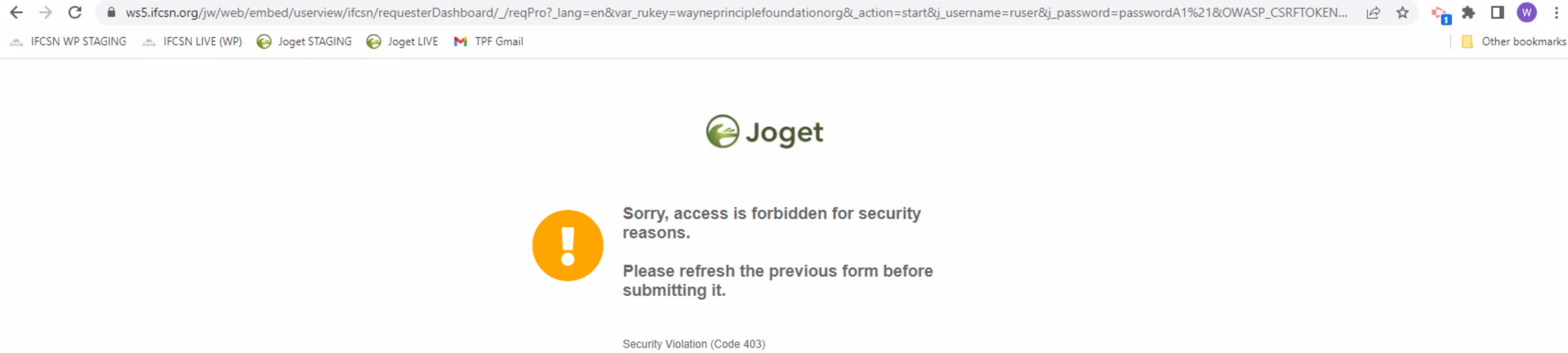 ERROR 06 Jun 2023 15:47:45 org.owasp.csrfguard.servlet.JavaScriptServlet - Referer domain 'https://ws5.ifcsn.org/jw/web/embed/userview/ifcsn/requesterDashboard/_/reqPro?var_rukey=wayneprinciplefoundationorg&j_username=ruser&j_password=passwordA1!&_lang=en' does not match request domain: 'http://ws5.ifcsn.org/jw/csrf'