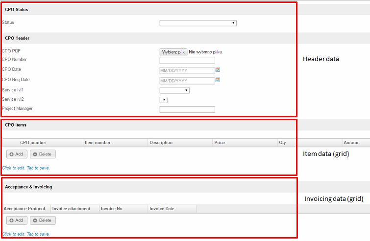 I have created 3 forms, of which only one will be visible by end user. The most important thing in here is the "Status" and "Project Manager" on CPO header.